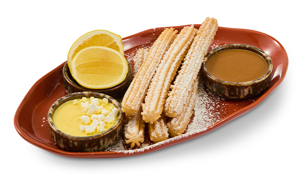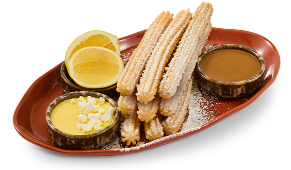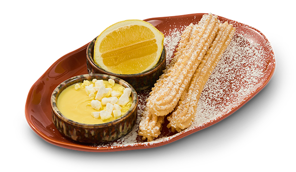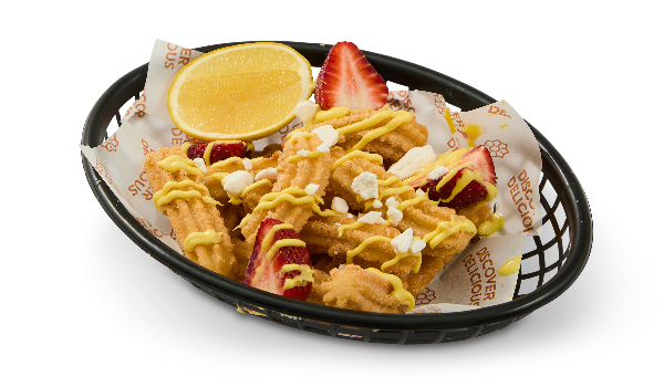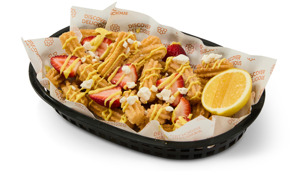 Mini churros, lemon crème drizzle, fresh strawberries, crushed meringue, and a squeeze of lemon